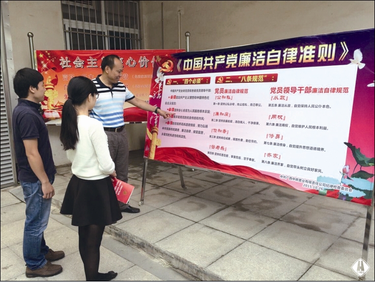 為增強學習貫徹的自覺性、主動性,把學習貫徹與具體工作實際結(jié)合起來,公司紀檢監(jiān)察室在第一時間進行宣傳貫徹。一是以短信形式,向公司全體黨員和中層以上干部發(fā)送2期《廉政知識學習卡》短信,并就“妄議中央”、“老鄉(xiāng)會、校友會、戰(zhàn)友會”、“四類人員不得買賣股票”、“社會主義核心價值觀”等內(nèi)容分4次發(fā)送短信進行解讀,以最快捷的方式、最簡潔的字句讓黨員干部及時了解和知曉《準則》和《條例》的關(guān)鍵內(nèi)容;二是組織黨委中心組成員集中專題學習;三是制作四版《準則》和《條例》宣傳版報,分別布置于二樓、三樓辦公走廊;四是為全體黨員訂購人手一份《中國共產(chǎn)黨廉潔自律準則、中國共產(chǎn)黨紀律處分條例、中國共產(chǎn)黨章程》單行本,全部發(fā)放到每一位黨員手中,要求原原本本、逐字逐句認真學習;五是在公司OA信息系統(tǒng)黨務紀工團門戶發(fā)布通知學習。