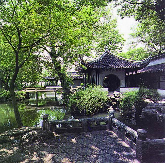 拙政園始建于明正德四年(公元1509年)。它雖經(jīng)過(guò)幾百年的蒼桑變遷,但這里處處山水明秀,廳榭典雅,花木繁茂,漫步在其中,你仍能感受到其平淡疏朗、曠遠(yuǎn)明瑟的明代氣息,游過(guò)全園,給我印象最深的是位于中部花園的最東面的"梧竹幽居",這里造型非常別致,四個(gè)大大的圓洞門(mén)使人馬上聯(lián)想起八月十五晚上的月亮。而更神奇的是如果你站在亭子里向外看,這四個(gè)圓洞門(mén)又恰似四個(gè)巨大的鏡框,鑲嵌著蘇州園林一年四季的風(fēng)光。